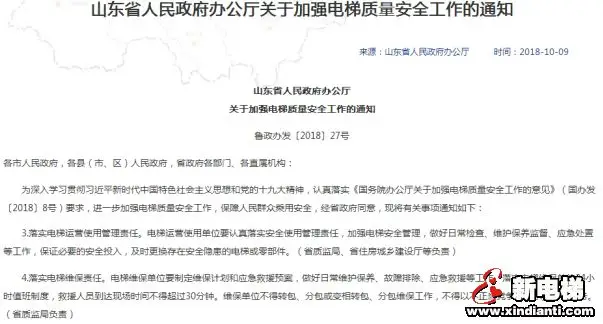 2018年10月09日,山东省人民政府发布了《关于加强电梯质量安全工作的通知》,在“落实电梯维保责任”中提到,山东省电梯救援人员到达现场时间不超过30分钟。